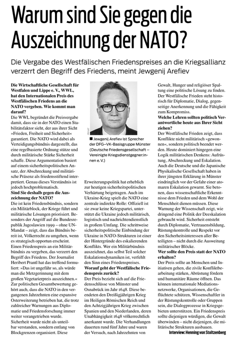 Die Wirtschaftliche Gesellschaft für Westfalen und Lippe e. V., WWL, hat den Internationalen Preis des Westfälischen Friedens an die NATO vergeben. Wie kommt man darauf?